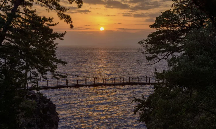 จุดเช็คอินที่เป็นไฮไลท์คือ สะพานแขวนคะโดะวะกิ (Kadowaki Suspension Bridge) ความยาว 48 เมตรที่อยู่สูงเหนือระดับน้ำทะเลด้านล่าง 23 เมตร พาดข้ามมหาสมุทรที่เชื่อมหน้าผาทั้ง 2 ฝั่ง